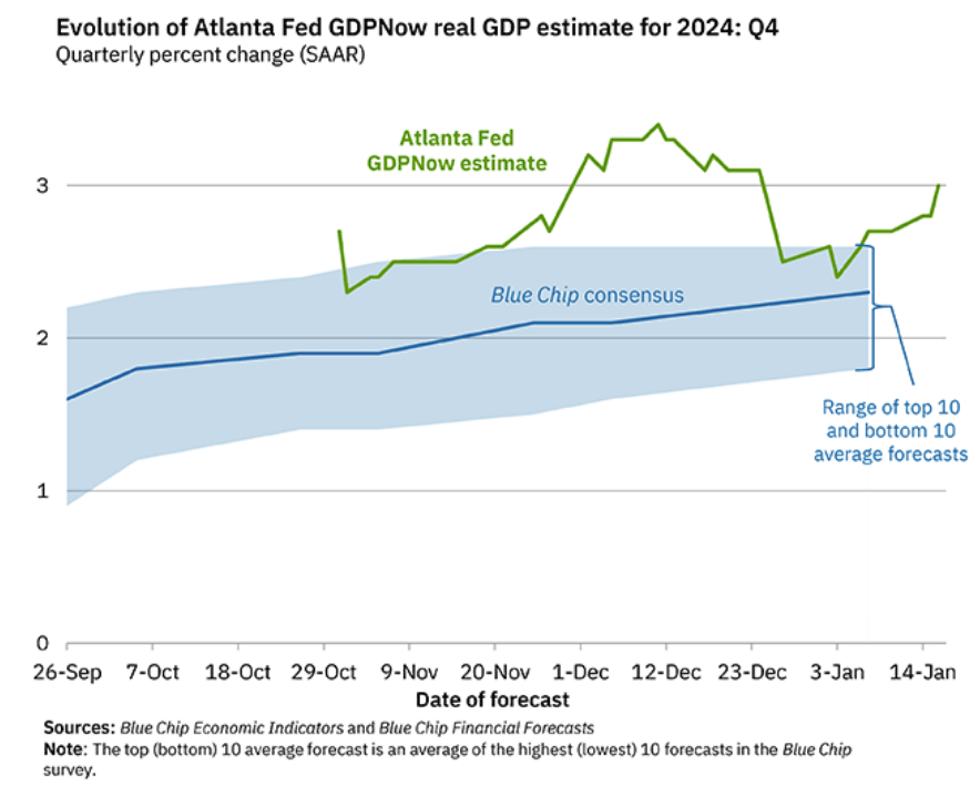 The Atlanta Fed’s GDPNow model raised its estimate this morning of December quarter real GDP growth from +2.7% to +3.0% due to strength in both personal consumption expenditures growth and government expenditures growth.
