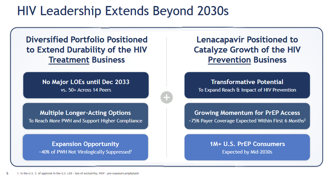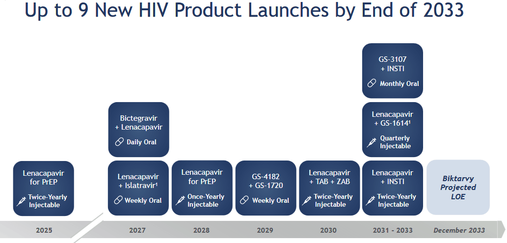 They expect lenacapavir to extend their HIV leadership beyond the 2030s. Because it is long-acting it should become the drug of choice for those already infected. In addition, it is very effective for HIV prevention, where it will launch this summer.