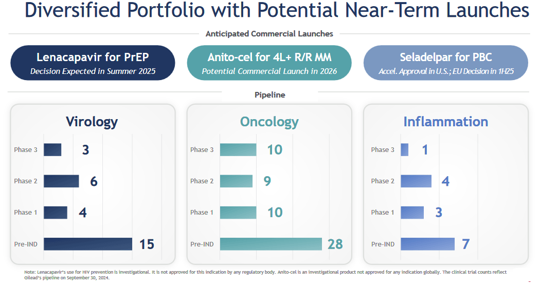 Dan said Gilead has a very deep pipeline of over 100 future drugs. They are deliberately diversified across therapeutic areas, mechanisms of action, and phase of development from preclinical to Phase 3. They expect three best-in-class near-term launches to drive their growth (R/R MM is relapsed/refractory multiple myeloma). The have more than 10 potential first-in-class drugs in Phase 2 and Phase 3 trials.