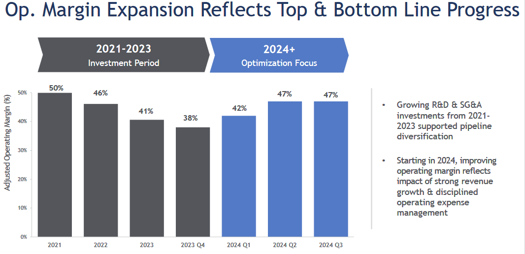 As the R&D investment that depressed earnings turns into commercial products, operating margins will expand.
