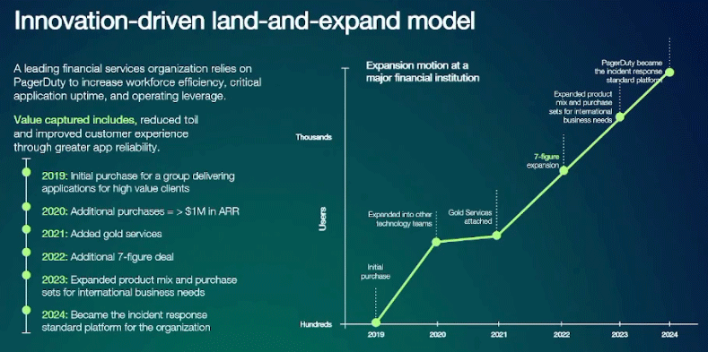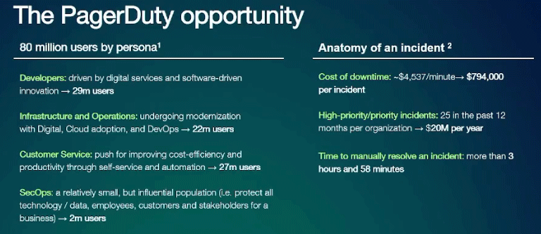 PagerDuty (PD – $18.61) presented at the Needham Growth Conference. CFO Harold Wilson gave the basic introductory presentation. He said they now have 15,000 paying customers, including 825 spending more than $100,000 a year, and another 15,000 in the free period that often leads to them becoming paying customers. Customers include half of the Fortune 500 and 87 of the Fortune 100.