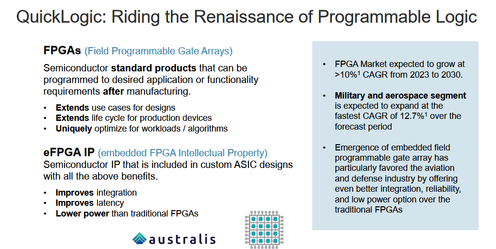 QuickLogic (QUIK – $9.09) presented at the Needham Growth Conference (AUDIO HERE and SLIDES HERE). CEO Brian Faith said customers asked them to provide field-programmable gate array technology to include in new ASICs (application-specific integrated circuits), which launched their new business model: