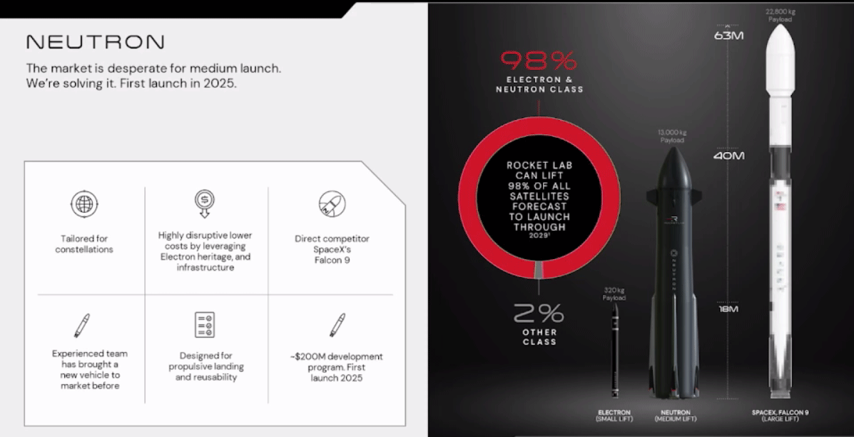 Electron can put about 660 pounds into orbit. Neutron can lift 28,660 pounds. It uses technology from Electron like carbon fiber fuel tanks instead of stainless steel to save rocket weight, which means more payload weight.