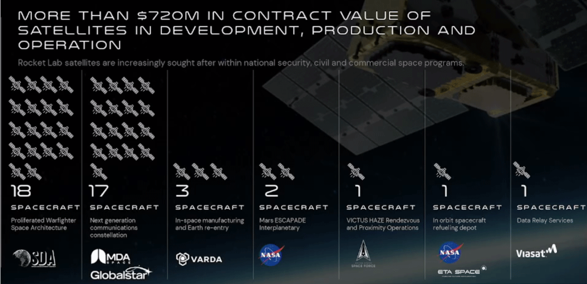 Rocket Lab has launched over 200 satellites on 58 Electron launches from the US and New Zealand. It is the second-most frequently launched US rocket and they have 40 spacecraft the backlog (a few of those are the forthcoming Neutron, a direct competitor to SpaceX’s Falcon 9). There are over 1700 satellites in orbit with Rocket Lab technology and they now have over 2000 employees across the globe. Over 70% of revenues are generated from non-launch activities. About 50% of revenues are from commercial customers, although 80% of their commercial customers are selling to the government, 30% from non-defense government, and 20% from defense.