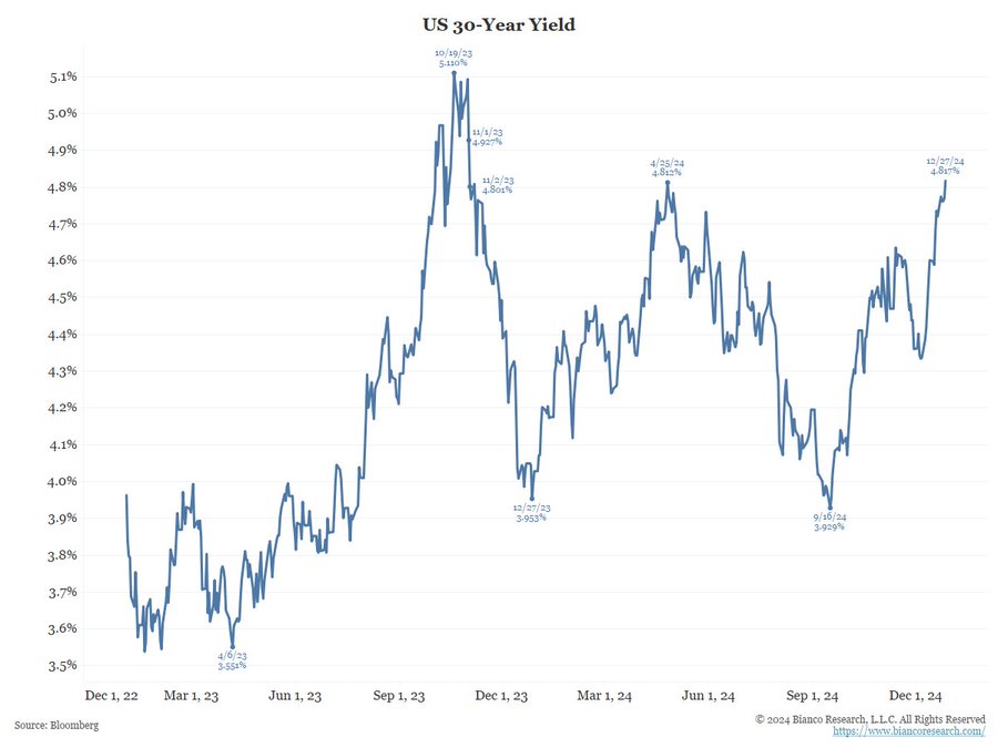 The bond market does not see a recession. The 10-year yield is just eight basis points away from a new 2024 high. The 30-year yield made a new 2024 closing high on December 27 at 4.811%, the highest yield since November 2023. It closed near that at 4.798% today.