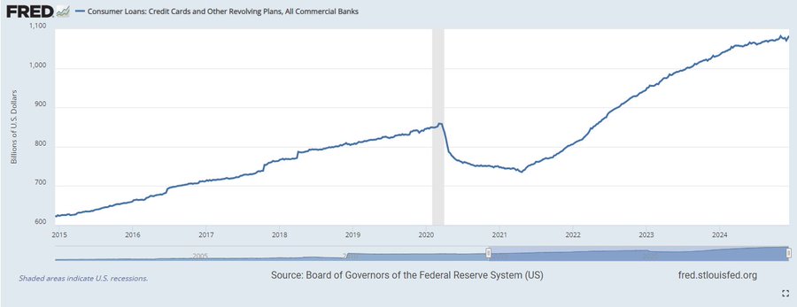 We are in the nosebleed seats on consumer credit card debt. Spending during the holiday shopping period (November 1 to December 24) rose 3.8% over 2023, according to a Mastercard SpendingPulse report. That was above the consensus forecast for a rise of 3.2% and topped the 3.1% increase during the same period last year.