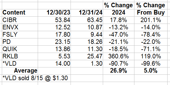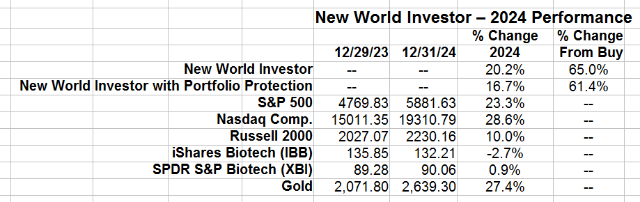 The average New World Investor recommendation finished 2024 up 20.2%, or 16.7% including the two S&P put recommendations that expired worthless. The biotech and small cap stocks made it underperform the S&P 500 and Nasdaq Composite.