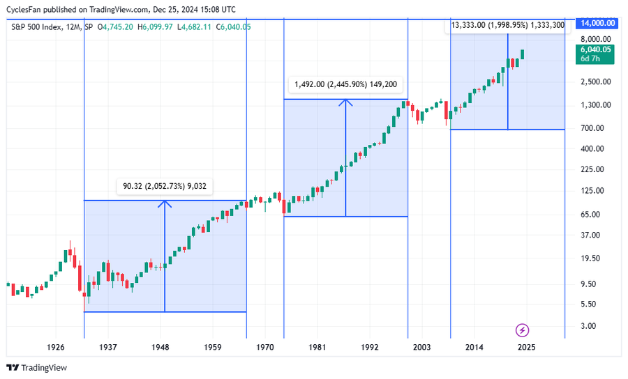Timmer pointed out that the S&P 500 is in the third secular bull market since 1932. The previous secular bulls were 1932-1966 (34 years), which gained 2053%, and 1974-2000 (26 years), which gained 2446%. The current secular bull started in 2009 and I expect it to top in 2036 (27 years). The minimum price target is 14000, up 2000% from the 2009 low, with ~15750 more likely.