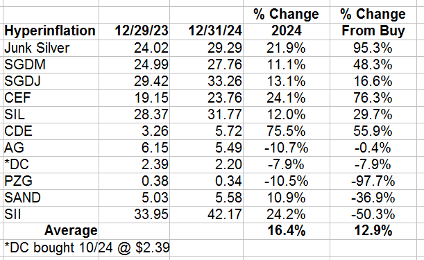 Right on both counts. The divisor was wrong by 1 on the averages for biotech, hyperinflation, cryptos (off by 2), and oil. The correct averages are: biotech -42.1%, hyperinflation 11.7%. cryptos 289.0&, and oil 12.0%.