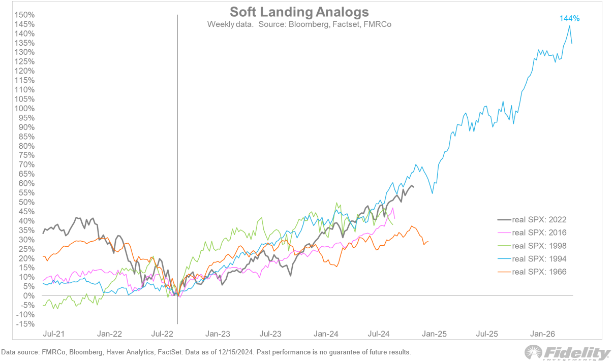 I agree with Jurrien Timmer, the Director of Global Macro at Fidelity Investments, who wrote: “The current era is of course reminiscent of the 1990’s. It’s interesting that this bull market has now outpaced all other soft landings except for the 1994-1998 rally. That boom, the result of the Maestro Alan Greenspan perfectly landing the plane in 1995 at a time when the Internet revolution was about to transform the market, seems as fitting an analog to today’s market as ever, although the 1998-2000 period might be an equally compelling contender given where valuations are.”