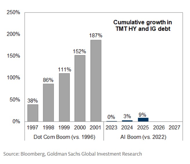 The key difference between the late 1990’s Dot Com and the current AI capex booms is that the dot coms were funded by high yield debt and a hot IPO market, while the AI boom is funded by cash flow from big, very profitable companies.