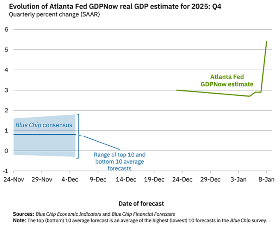 The Atlanta Fed’s GDPNow model forecast for December quarter real GDP doubled to +5.4% on holiday strength in personal consumption expenditures growth and a sharp drop in imports.