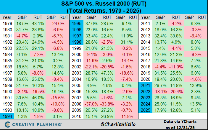 US Large Cap stocks outperformed US Small Cap stocks by 5% in 2025, their fifth straight year of outperformance. That ties 1994-1998 for the longest streak of Large Cap outperformance ever. That prior streak was followed by six straight years of Small Cap outperformance (1999-2004).