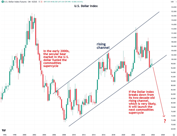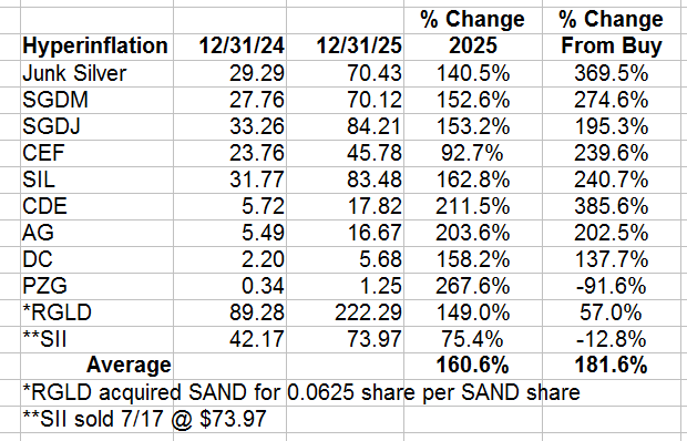 Hyperinflation – 2025 was the year our precious metals stocks paid off…well, began to pay off. The “debasement trade” should continue to pay off until the Administration stops running huge deficits and the Fed stops funding them.