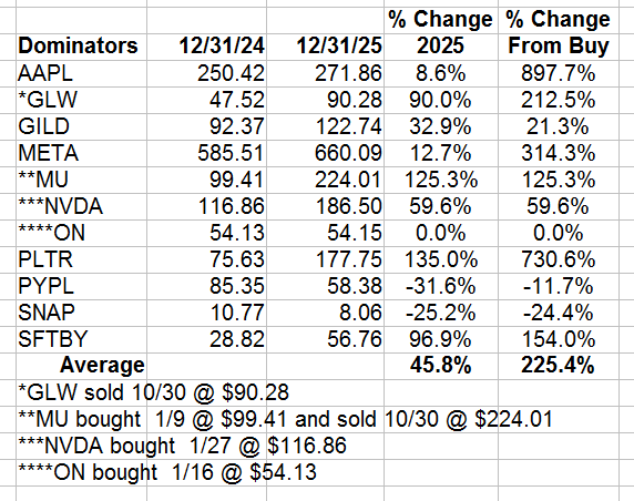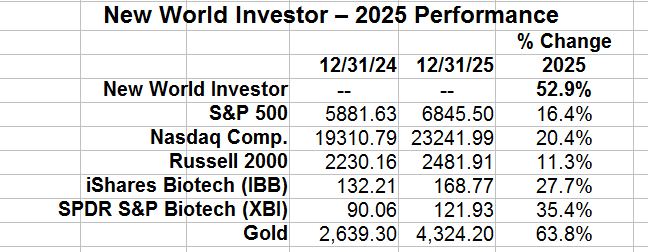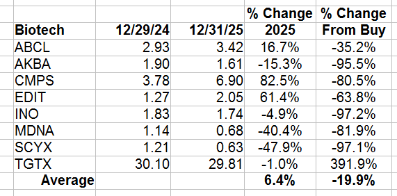 Biotech – Although the biotech stock average was up, five of the eight recommendations were down. The big biotech stocks ended their bear market in 2025, and I expect the small ones to follow in 2026.
