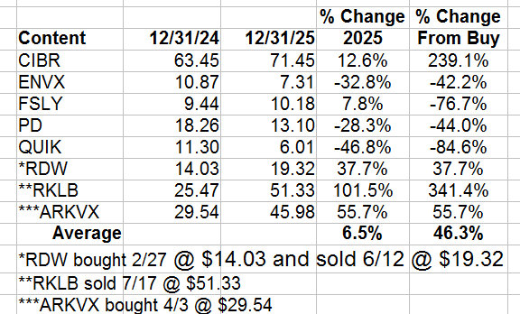 Small Tech – So I guess it’s not surprising that the small tech stocks under-preformed the large ones. Enovix (ENVX) suffered from the risk-off environment because it wasn’t in commercial production in 2025, although it will be in 2026. Both PagerDuty (PD) and QuickLogic (QUIK) fell due to disappointing results. QUIK will be OK in 2026, but we’ll have to see about PD.