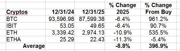 Crypto – The cryptocurrency recommendations were down for the year. Despite reaching a fresh record high at $126,000 in early October, bitcoin had its first annual loss since 2022.