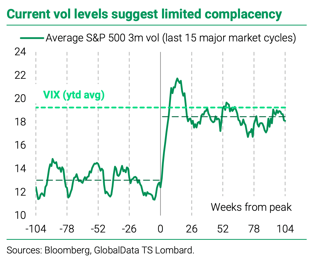 This is really important. The VIX Fear & Greed Index has a lot of information if you know how to see it. There tends to be two distinct VIX regimes: a low VIX range (11-15) when investors are complacent before the market peak and a high VIX range (17-19) thereafter. The high average level of the VIX so far in 2025 tells us that investors are not overly complacent and the ground is not about to fall out from underneath the market’s feet.