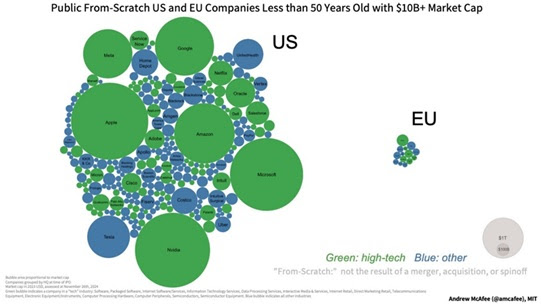 What Kuppy is missing is that there are many big data center buyers besides the hyperscalers who (1) don’t care about profitability; and, (2), can print the money to build them. I refer, of course, to governments and sovereign AI. Governments around the world missed the Internet boom. Look at the number of $10 billion companies created in the US (left) and Europe (right) in the past 50 years: