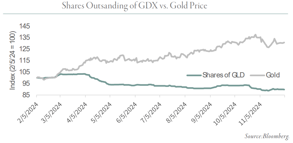 Gold prices fell 3.7% month-over-month in November, the biggest monthly decline of 2024, probably due to the stronger dollar since President Trump’s election. The PBoC may be capitalizing on lower prices to bolster its gold reserves, now up to 5.9% of its foreign exchange holdings from 3.5% in 2022.