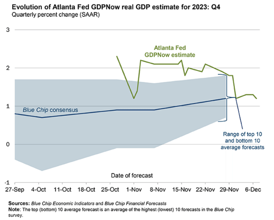 The Atlanta Fed’s GDPNow model forecast for December quarter real GDP growth has fallen shapely to +1.2%, the same as the Blue Chip economists. The main weakness is in personal consumption expenditures and private domestic investment growth, with a little from weak net exports.