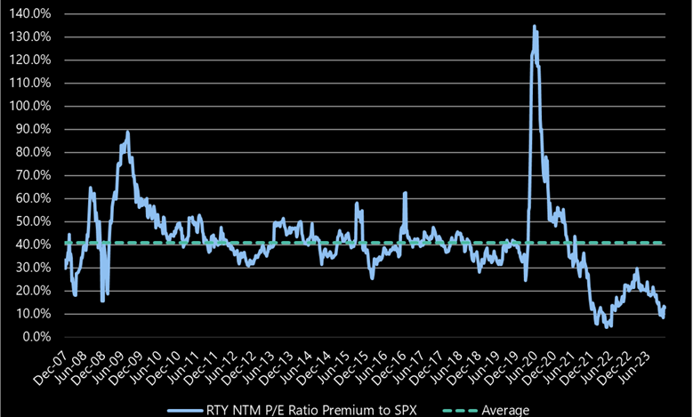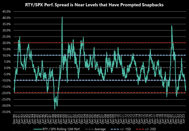 In addition to the standard deviation data, small-caps rarely get this cheap versus large caps. Using a simple next-12-months P/E ratio, the RTY is trading at just a 13% premium to the S&P 500. That level is near recent lows and well below where the relative valuation bottomed in the Great Financial Crisis. As a result – and unlike large caps – small caps are pricing in some pretty bad news already.