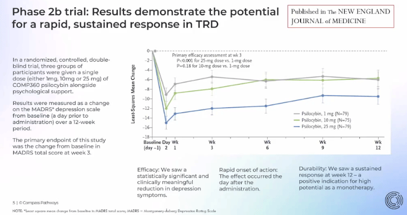 Compass Pathways (CMPS – $9.18) presented at the Needham Healthcare Conference (AUDIO HERE). The two Phase 3 trials are on track, the first for a top-line data release at the end of 2024 and the second for a data release in mid-2025. A Phase 2 study in PTSD will read out in the next couple of months.