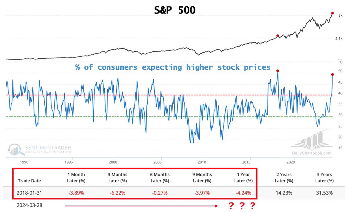 The newest Conference Board survey showed 49.3% of consumers expect higher stock prices. That number has only ever been higher once, in January 2018 at 51.0%. Following that instance, the S&P had mildly negative returns over the next 12 months, followed by a huge rally.