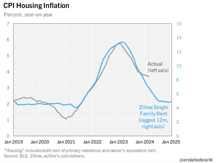 @ernietedeschi, former Chief Economist at the White House Council of Economic Advisers, showed how the Zillow single family rent data leads the CPI shelter component by 12 months: