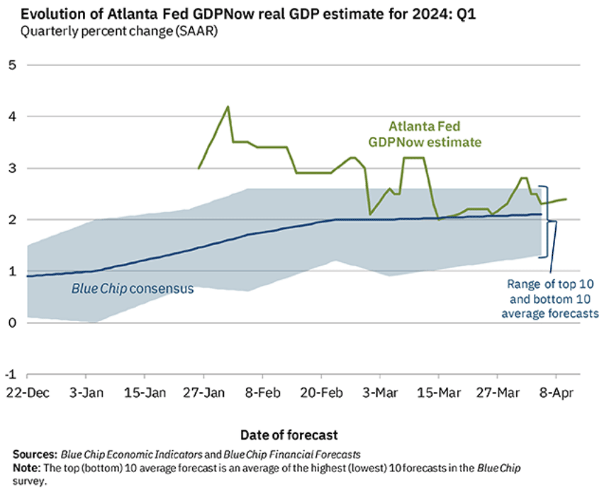 The Atlanta Fed’s GDPNow model now is predicting March quarter real GDP growth of +2.4%, still a bit above the consensus for +2.1%. We get the first estimate in two weeks on April 25.
