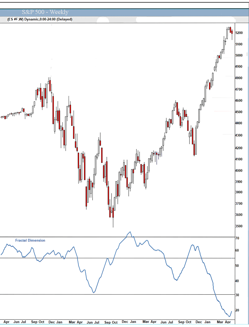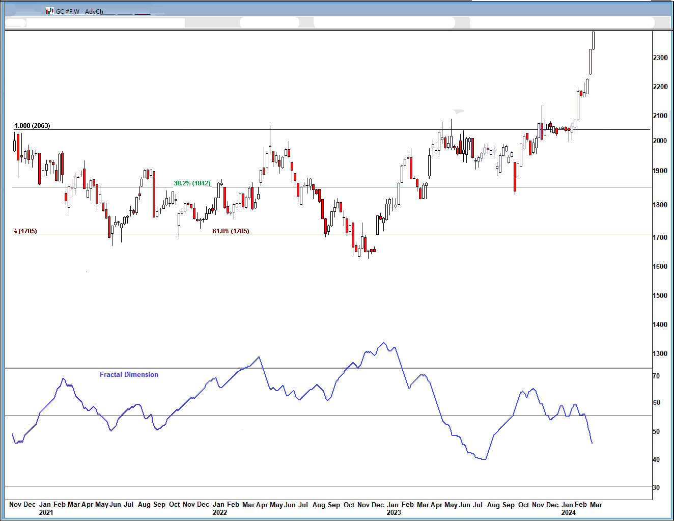 The fractal dimension continues to grind out the necessary consolidation. As I said last week, this could continue for quite a while.