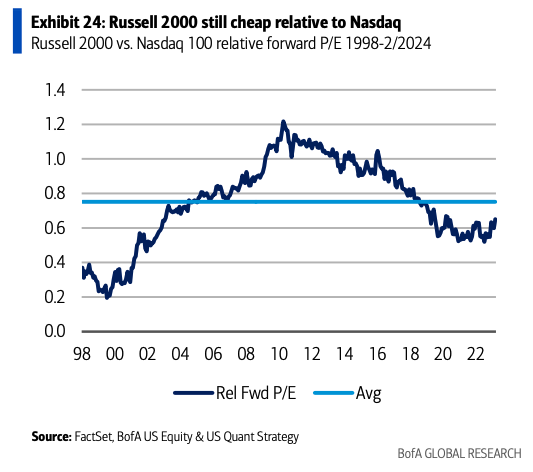 The small-cap Russell 2000 fell 0.5% and is (barely) up 0.8% in 2024. BofA said: “The Russell 2000 remains historically cheap vs. the Nasdaq, and as the overall corporate profits backdrop continues to broaden/accelerate, we see better trends for US small caps.”