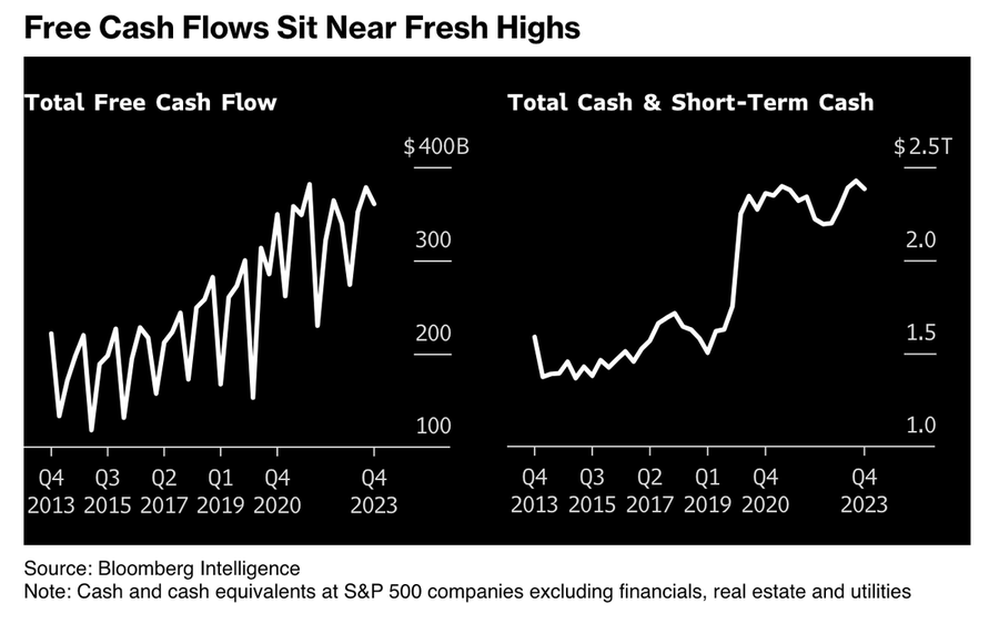 In the real world, corporate cash and free cash flow are at record high levels, supporting stock prices as we head into March quarter earnings results.