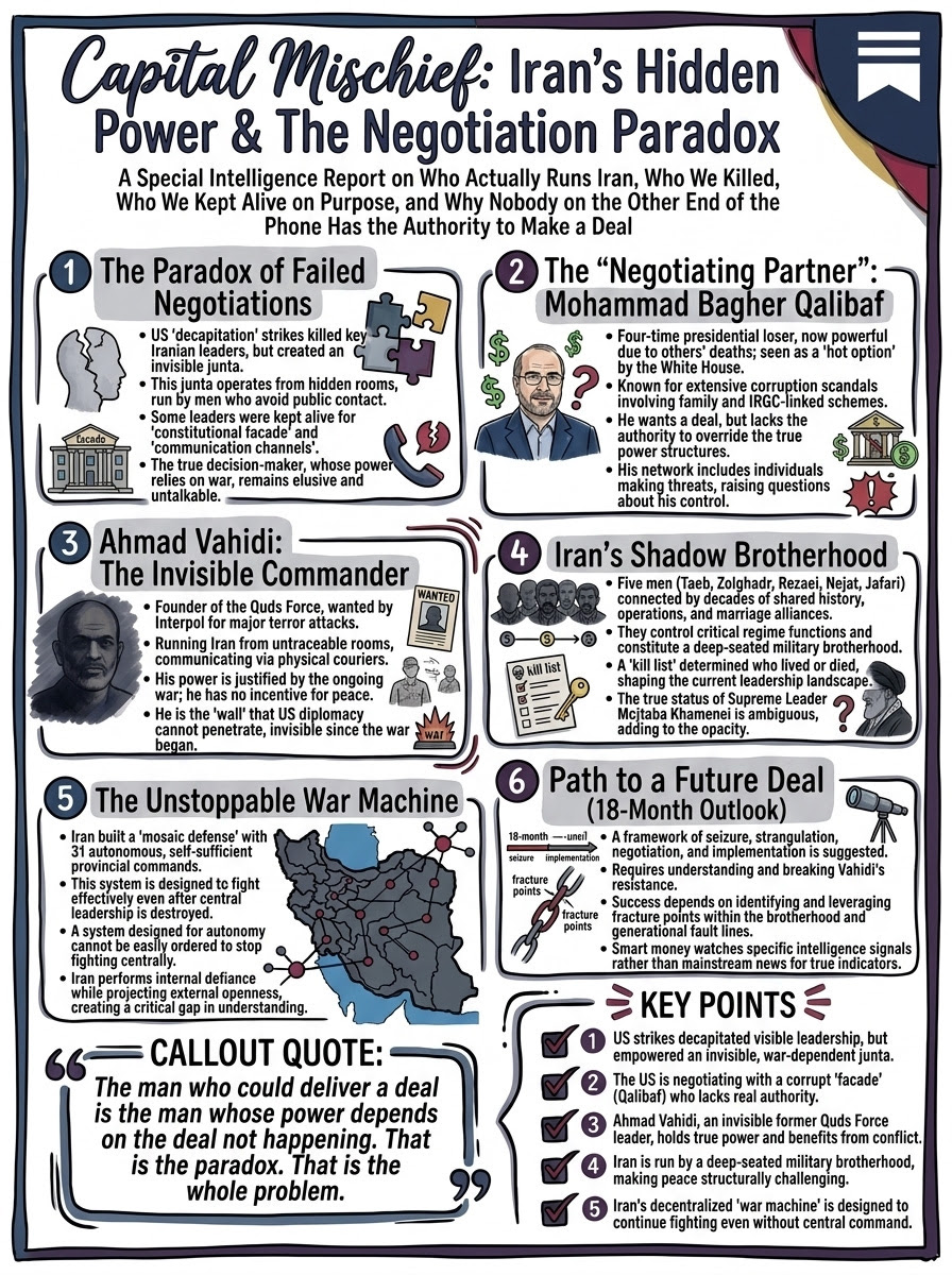 One quote that explains the entire Iran war. The negotiating partner who cannot negotiate. The invisible commander who will not. The brotherhood nobody elected. The war machine nobody can turn off. And the 18-month path to a deal that does not exist yet.