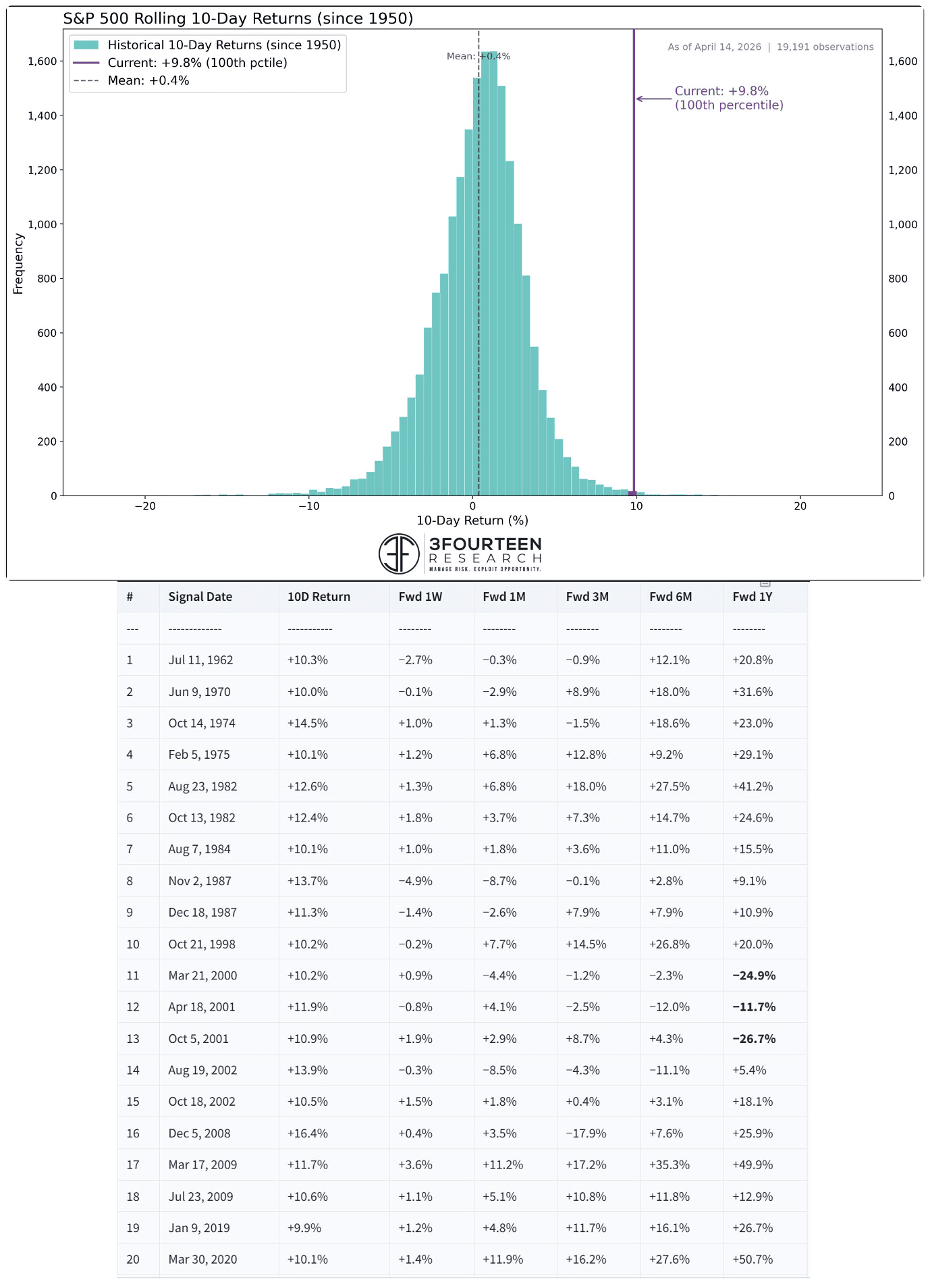 The S&P 500 added 6.7% over the last two weeks in the 5th-quickest recovery ever from a deep pullback. It got back into positive territory for the year, and reclaimed all of its losses since the start of the war in Iran. It hit new intraday (7,051.23) and closing (7,041.28) highs today. The last 10 days have been unlike any 10-day period in the market since 1950. The S&P 500 is up 9.8% in 10 days, which is in the 99.7th percentile of all 10-day returns. Since 1950, there have been 20 cases where the stock market has risen this much in 10 days. The general conclusion is that these are bullish momentum thrusts.