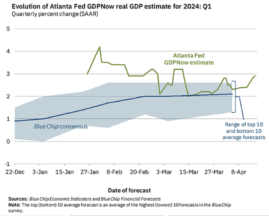 The Atlanta Fed’s GDPNow model next-to-last estimate of March quarter real GDP growth ticked up from 2.8% to 2.9% due to a bit of strength in personal consumption expenditures and private domestic investment, The Blue Chip economists are estimating just over 2.0%, so we should see a slightly positive “surprise” on April 25.