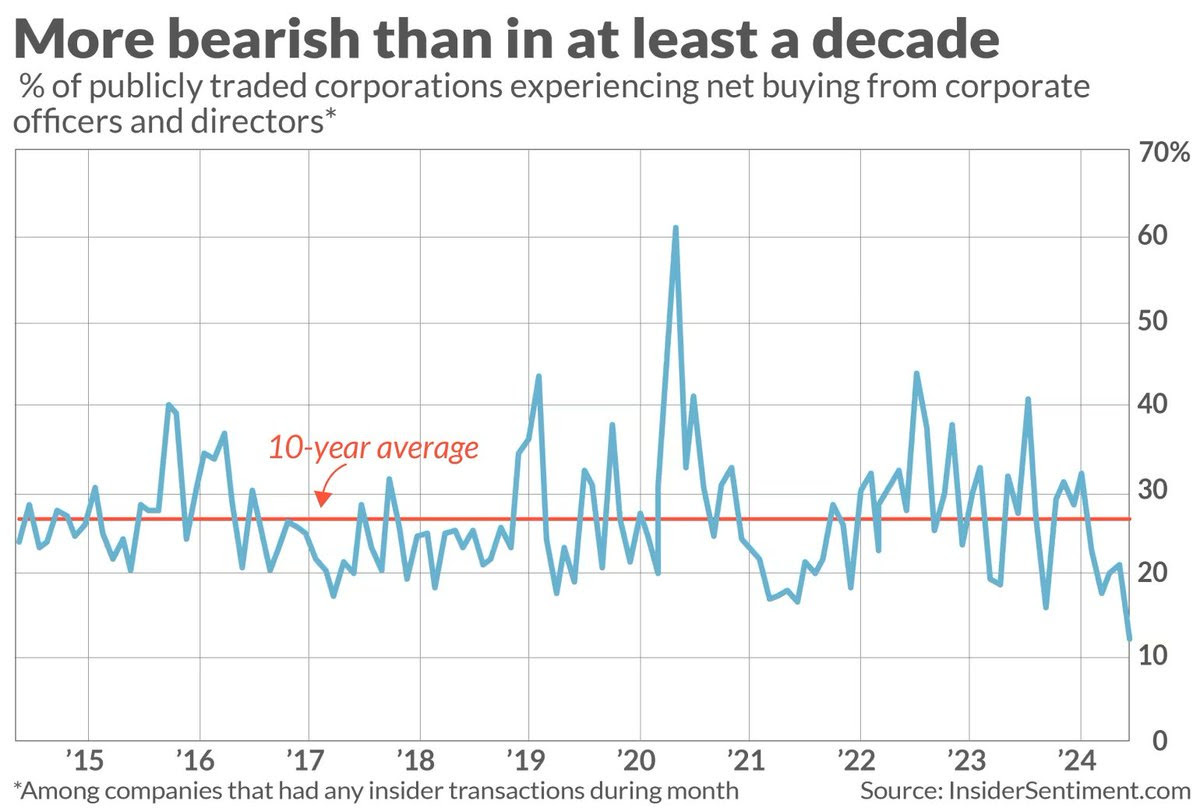But retail investors still fear the Fed, and net stock buying by corporate insiders of publicly traded companies is the lowest in at least a decade. I think that’s just because these are the highest prices they’ve seen in a decade.
