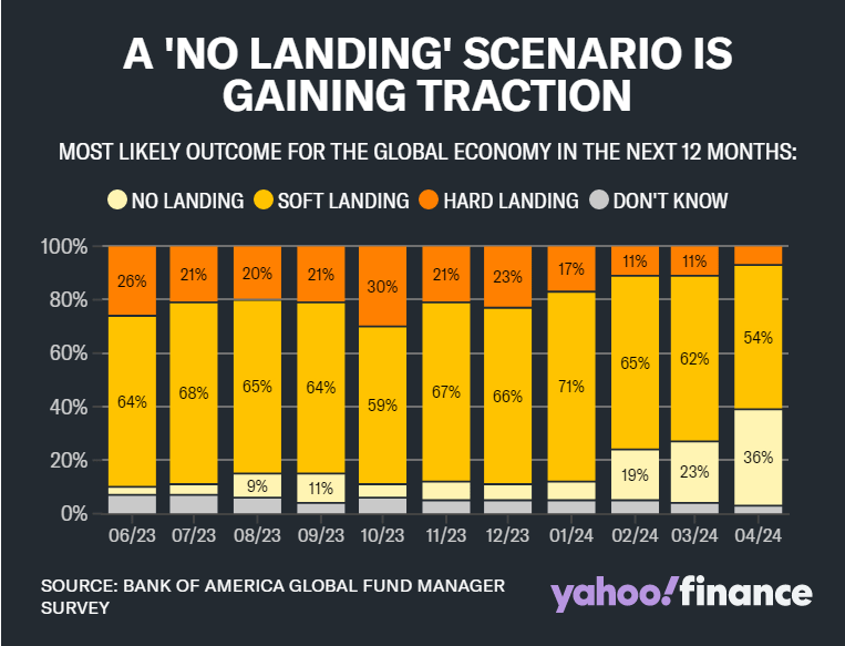 In fact, according to the latest BofA Fund Managers Survey, 36% of fund managers now believe the most likely outcome for the global economy is a “no landing” scenario. This was substantially higher than the 23% who saw the outcome a month ago, and the highest level seen since June 2023.