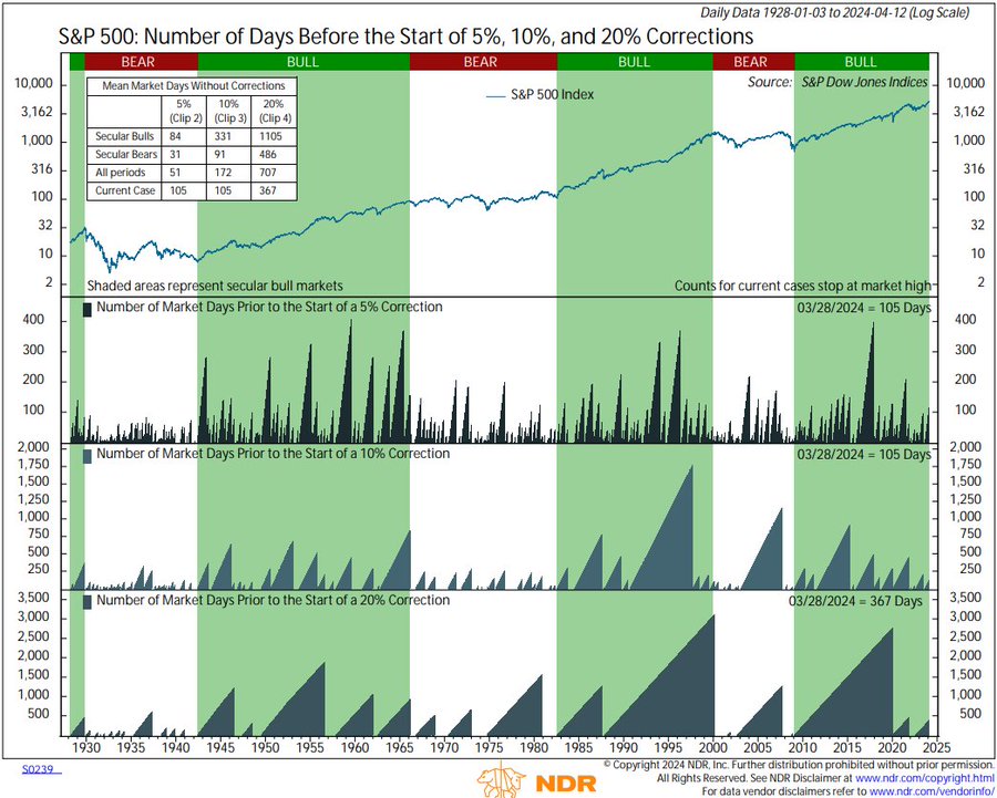 The S&P 500 lost 3.6% since last Thursday as weak hands panicked at “high for longer.” The Index now is only up 5.1% year-to-date. It has been 107 days since the last 5% correction in the S&P. Since 1928, during secular bull markets, 5% corrections occurred about every 84 days on average. It has also been 107 days since a 10% correction. 10% declines typically occurred every 331 days on average during secular bulls. The S&P 500 currently is off 4.82% from its all-time high on March 28 at 5264.85 h/t @NDR_Research.