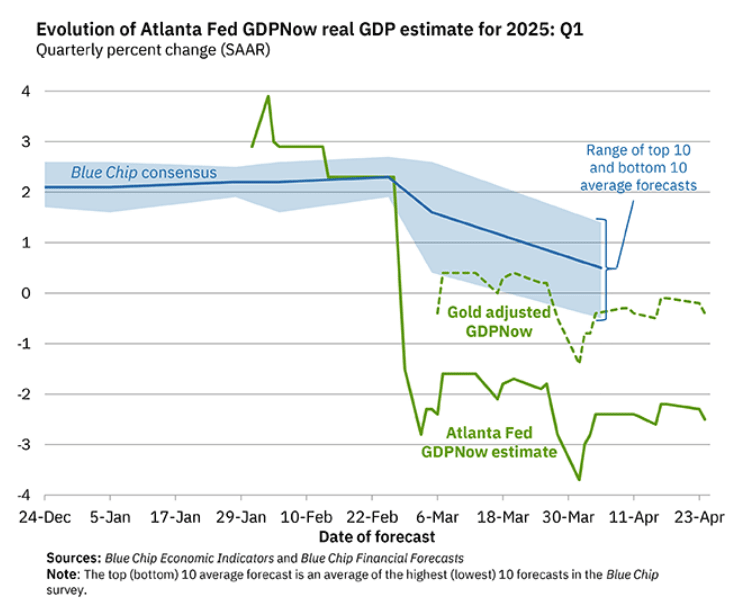 The Atlanta Fed’s GDPNow model estimate for March quarter real GDP growth slipped a bit from -2.2% to -2.5% due to weaker housing numbers. The alternative model that excludes gold imports is at -0.4%.