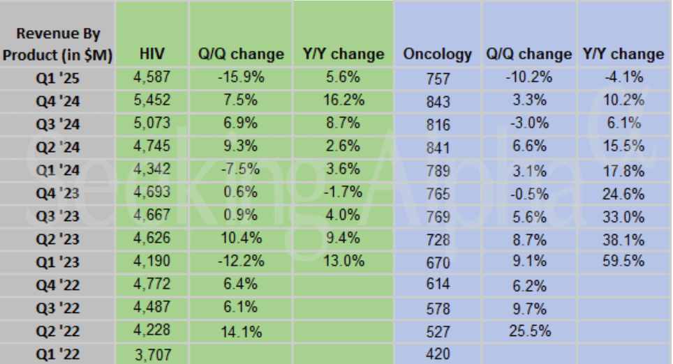 March quarter HIV revenues always are lower than December, but grew 5.6% year-over-year. They are only weeks away from the June 19 PDUFA date for twice-yearly injections of lenacapavir for HIV prevention. They will launch in the US immediately following the decision.
