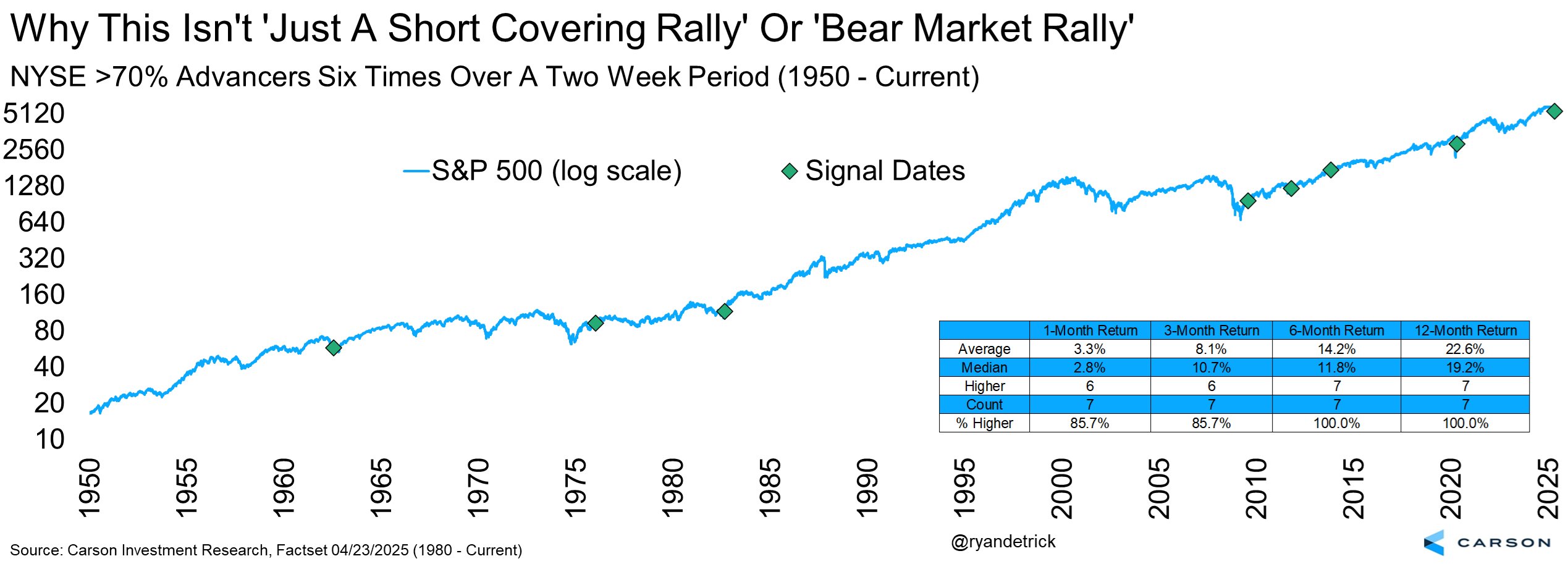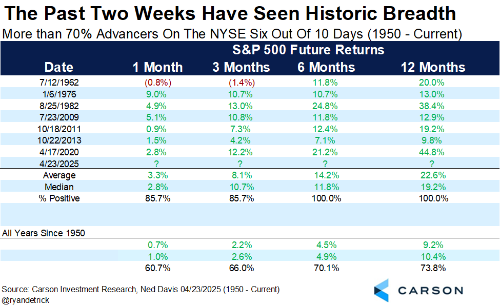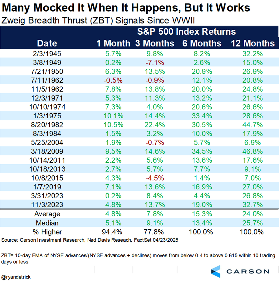A Zweig Breadth Thrust signaling the start of a new bull market happens when the 10-day moving average moves from below 40%, indicating an oversold market, to a level above 61.5% within any 10-day period. This is a rarely occurring event. Since World War II, it has happened only 18 times After a Zweig Breadth Thrust, the S&P 500 has NEVER been lower 6 or 12 months later.