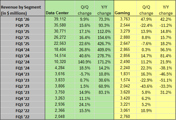 The big revenue chunk is, of course, data centers, which was up 73.3% from last year’s blowout quarter. Gaming had a record quarter, but it’s now less than 10% of data center.