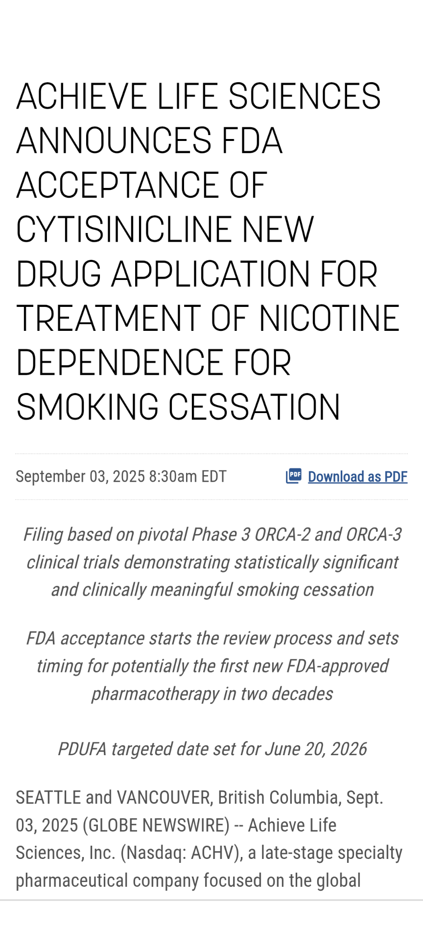 My modest valuation of ACHV. The latest Sept 2025 presentation on their site (they don’t have the replay of the HCW conference 9/8)–$11 billion market opportunity. Chantix peaked at 2.8 million scripts, or $800 million annual sales. ACHV’s drug candidate is a better version of Chantix, much lower % of side effects, although not zero. Conservatively, I’ll say $1 billion for ACHV’s drug, only 9% uptake. For peak revenue of $1 billion, use price/sales of 5 for $5 billion market cap (MC) at peak sales in several years. Current PPS is $3.17 at MC of $162 million. That’s $19.57 at $1 billion MC, or almost $100 PPS at $5 billion MC. This assumes no share dilution. How long will it take for ACHV to break even and then not require dilution? Cash runs out 2H 2026. There will be expenses for the vaping trial, July 2026 launch and continued marketing. In 2030, after 4 years of marketing, both cigarettes and vaping will have great sales. If the drug has $2 billion in sales, still well below $11 billion potential, the diluted stock could be $100-200 in 5-10 years. If you’re over 80 today, sell on approval at maybe $15. I’m 72 and will probably hold for much higher prices.