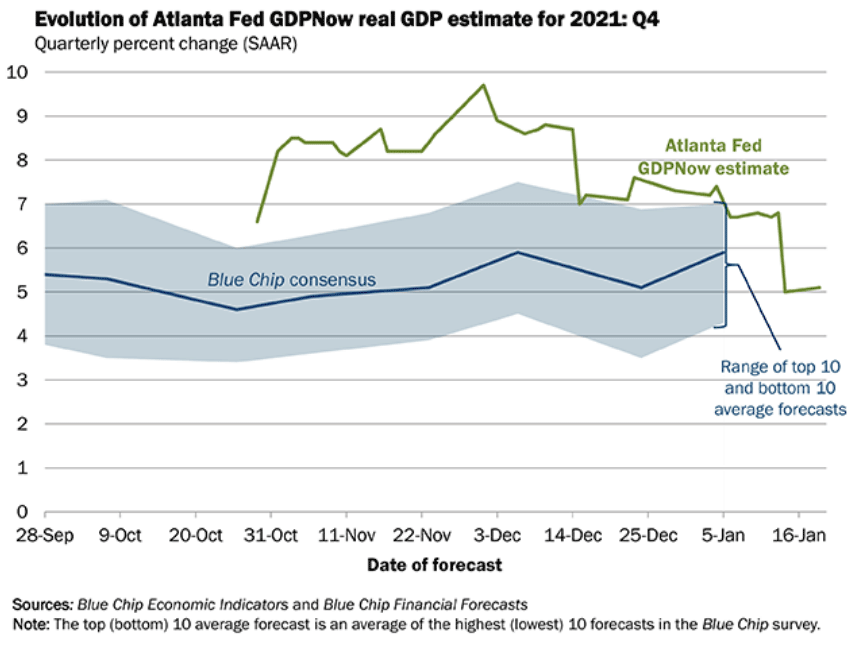 The decline in retail sales in December has taken fourth-quarter real GDP estimates down. Goldman Sachs cut their estimate by a half-point to +6½%, and the Atlanta Fed’s GDPNow estimate is down to 5.1%. We get the official first estimate next Thursday before the open.