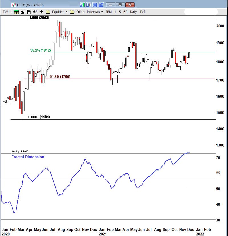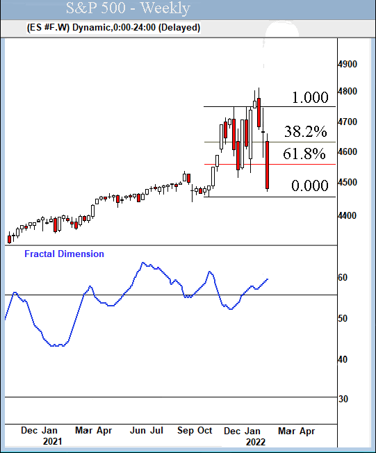 The fractal dimension got even more consolidated as the Index fell through the 61.8% retracement level, almost wiping out the fourth-quarter rally. A break below 4450 would be very serious with this amount of fractal energy.
